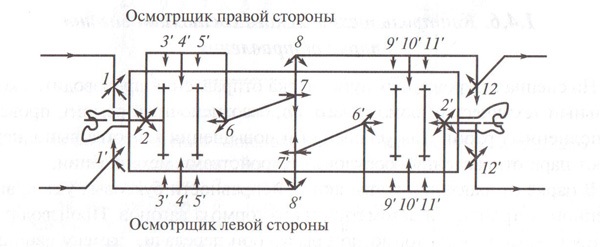 Осмотрщик правой стороны вагона осуществляет контроль технического состояния по позициям, отмеченным цифрами со штрихом.